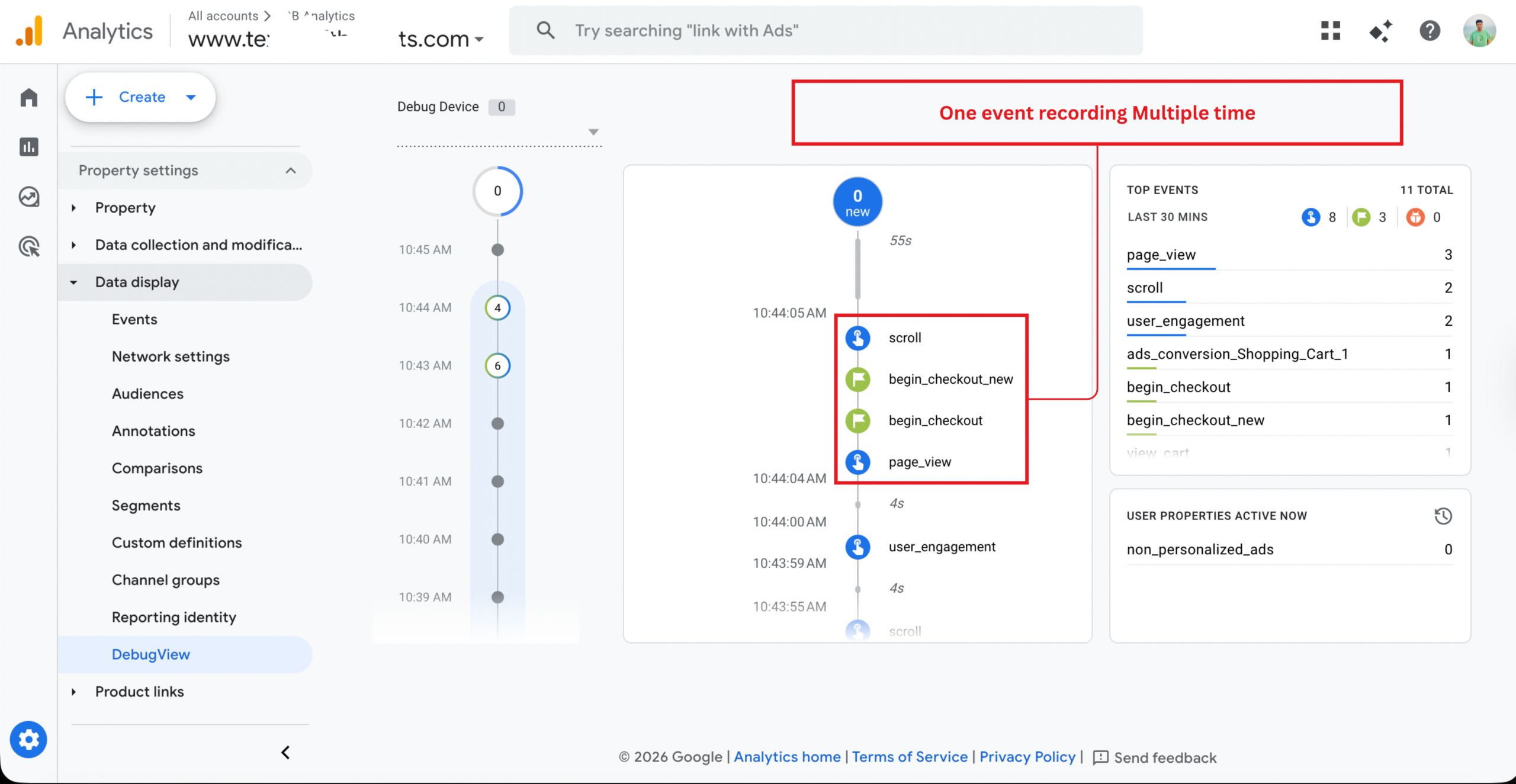 GA4 DebugView showed that a single action was triggering multiple events, including duplicated checkout events.