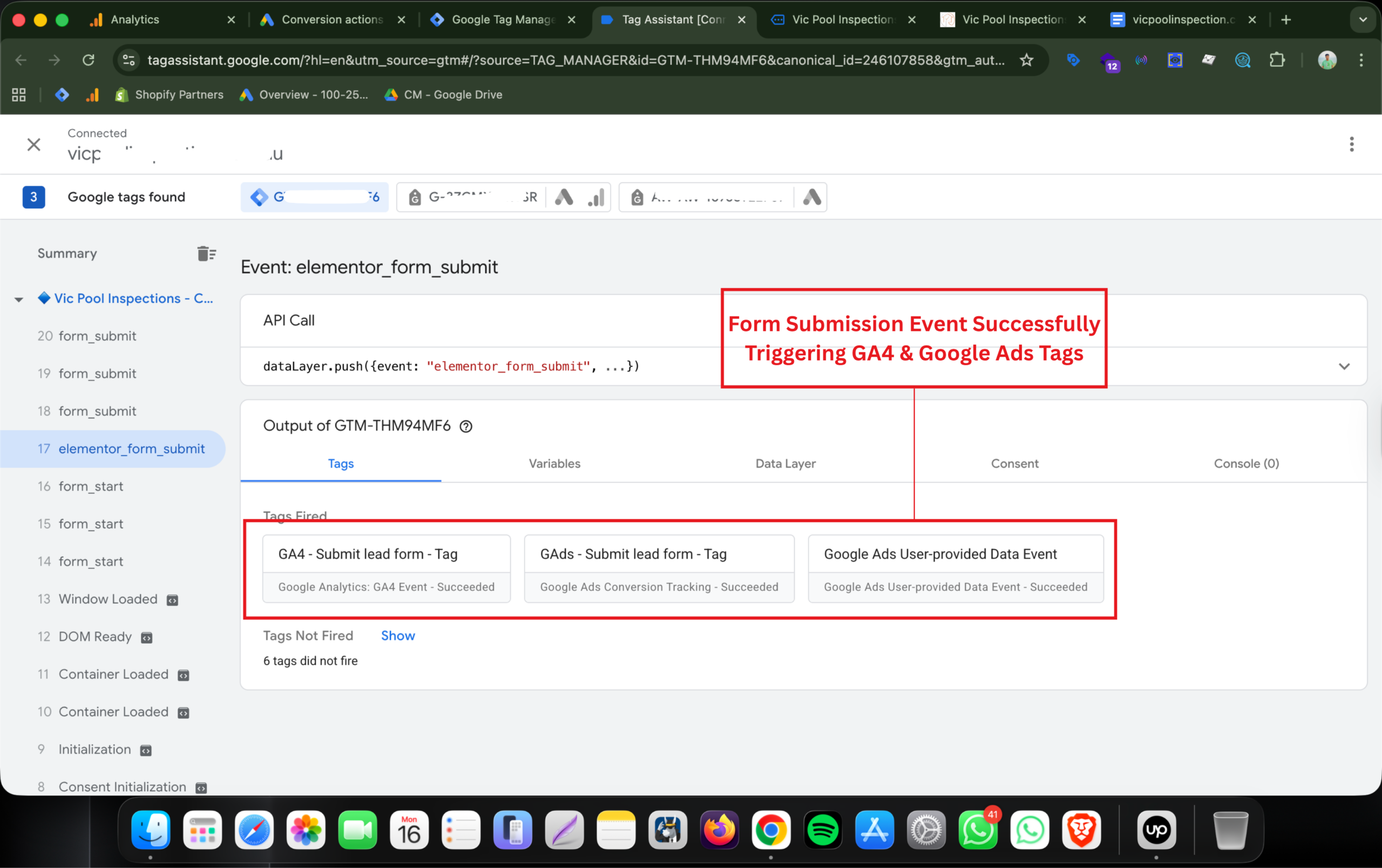 A custom JavaScript listener was developed to detect Elementor form submissions and push events into the DataLayer. This ensures accurate lead tracking in GA4 and Google Ads through GTM.