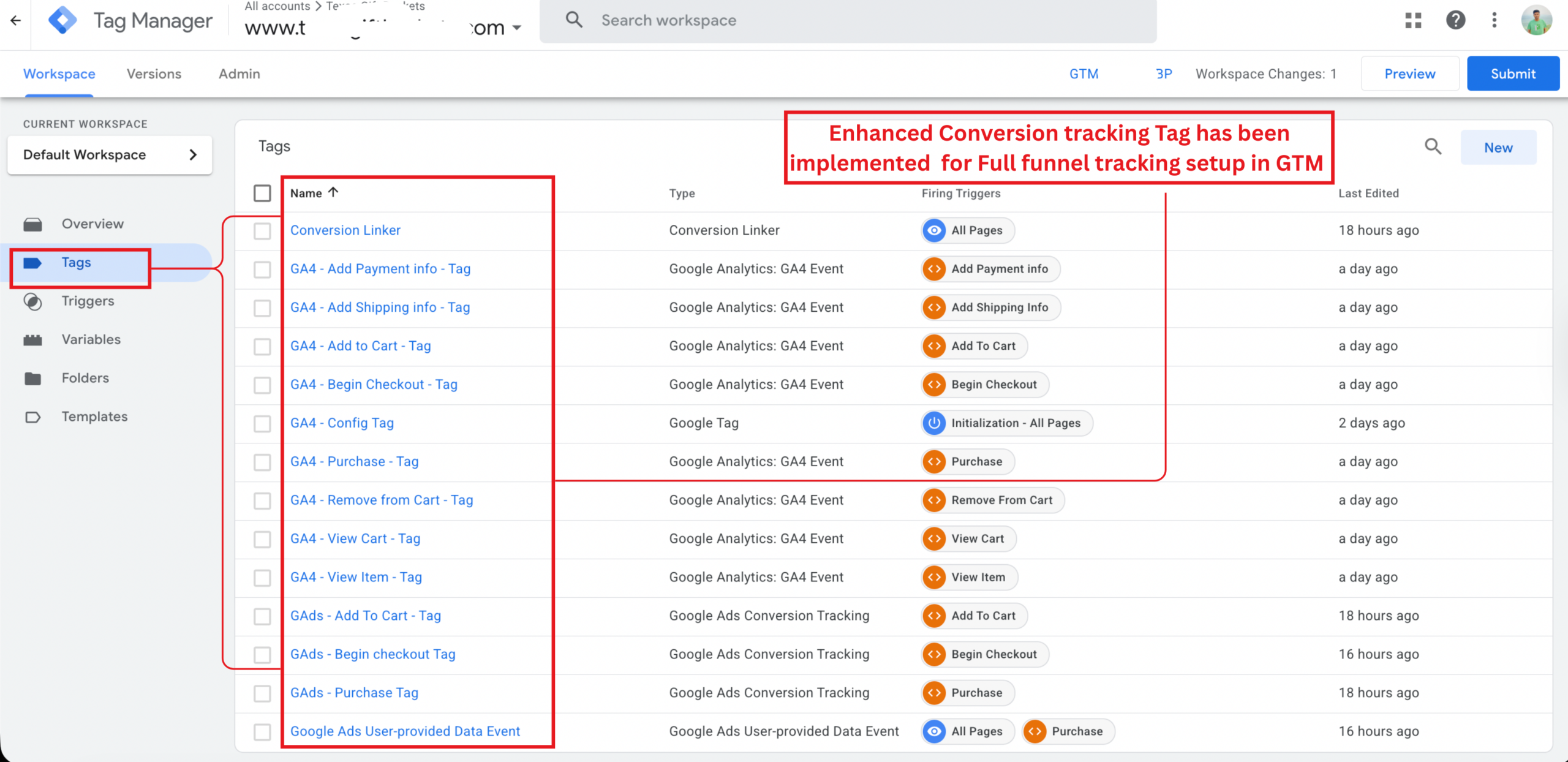 Configured custom triggers in Google Tag Manager for key Shopify ecommerce events.