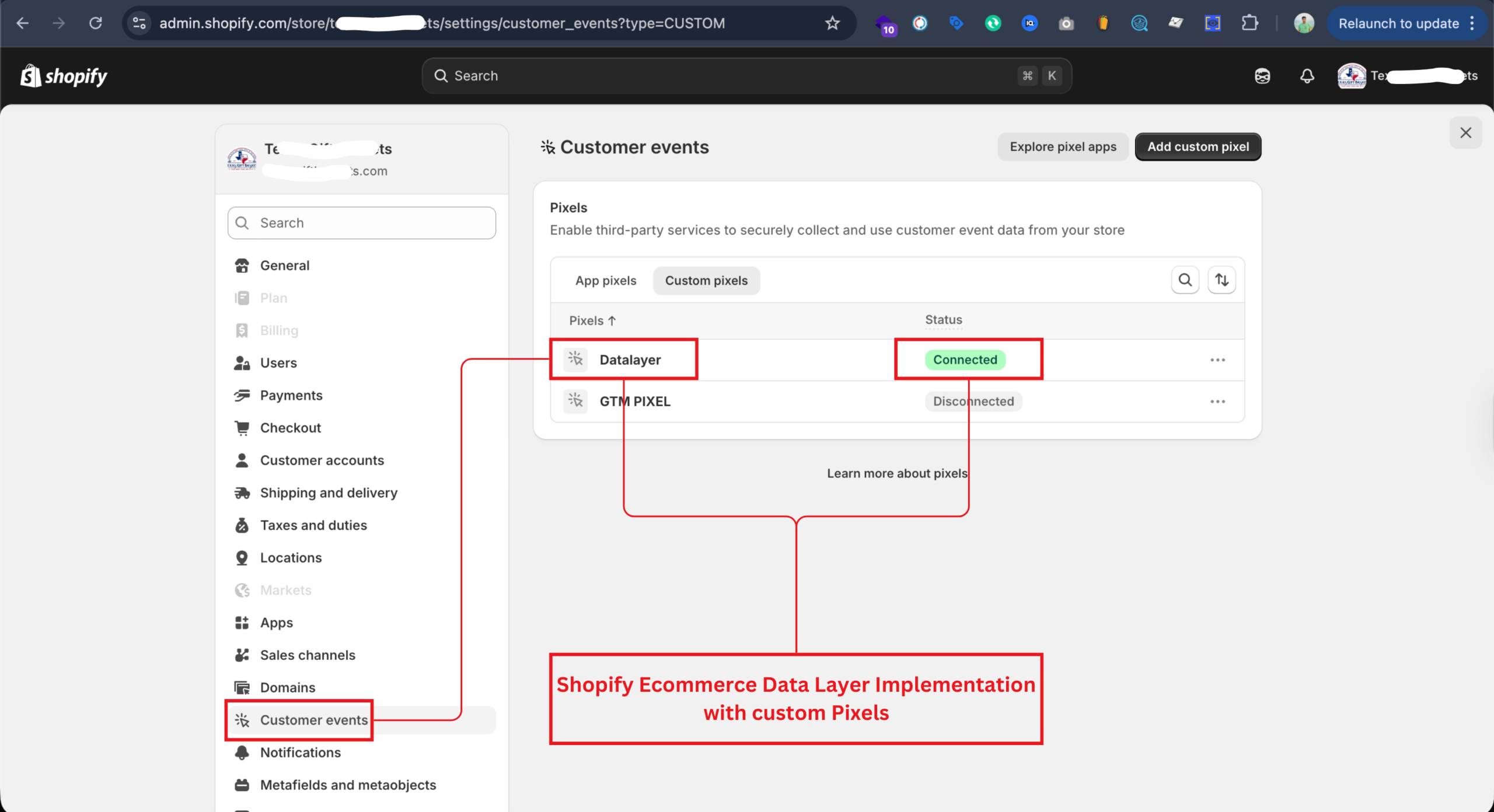 Configured Shopify customer events and custom pixel to push ecommerce data into GTM.